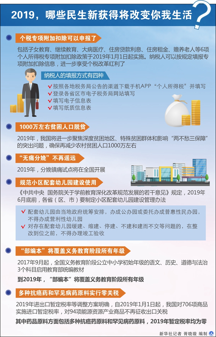 告別2018,迎來2019。新的一年,個稅改革紅利進一步釋放,更多貧困人口將實現(xiàn)脫貧,生娃、入托、上學、用藥等方方面面都將發(fā)生深刻變化。2019,哪些民生新獲得將改變你我生活?