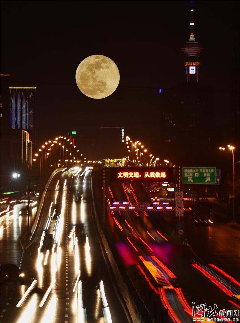 1月21日18時(shí)許,“超級(jí)月亮”升起在石家莊市槐安路。