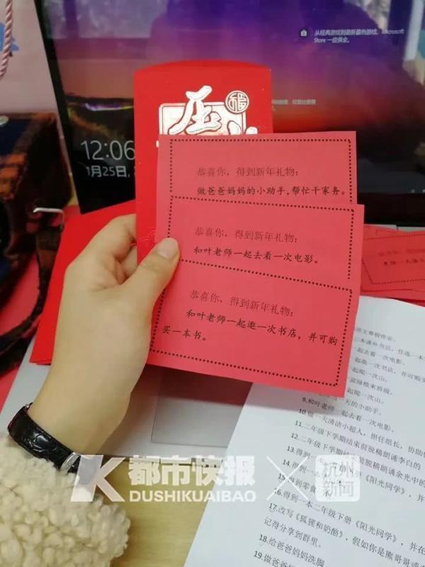 仔細閱讀每個“紅包”上的內容,可以看出葉老師的初衷,是為了學生的全面發(fā)展。除了減免一項語文寒假作業(yè)、和葉老師一起去看一次電影、得到一個葉老師牌愛的抱抱之類的幸運獎,更多的是,做一天清潔小超人、做爸爸媽媽的小助手、制作PPT等考驗學生“德智體美勞”的作業(yè)。