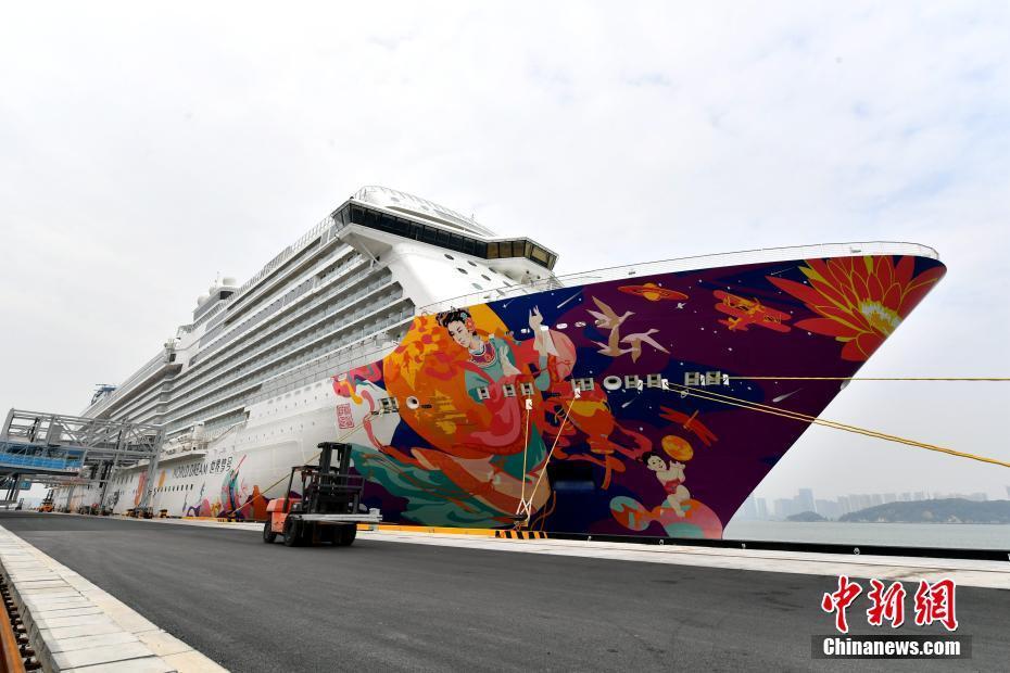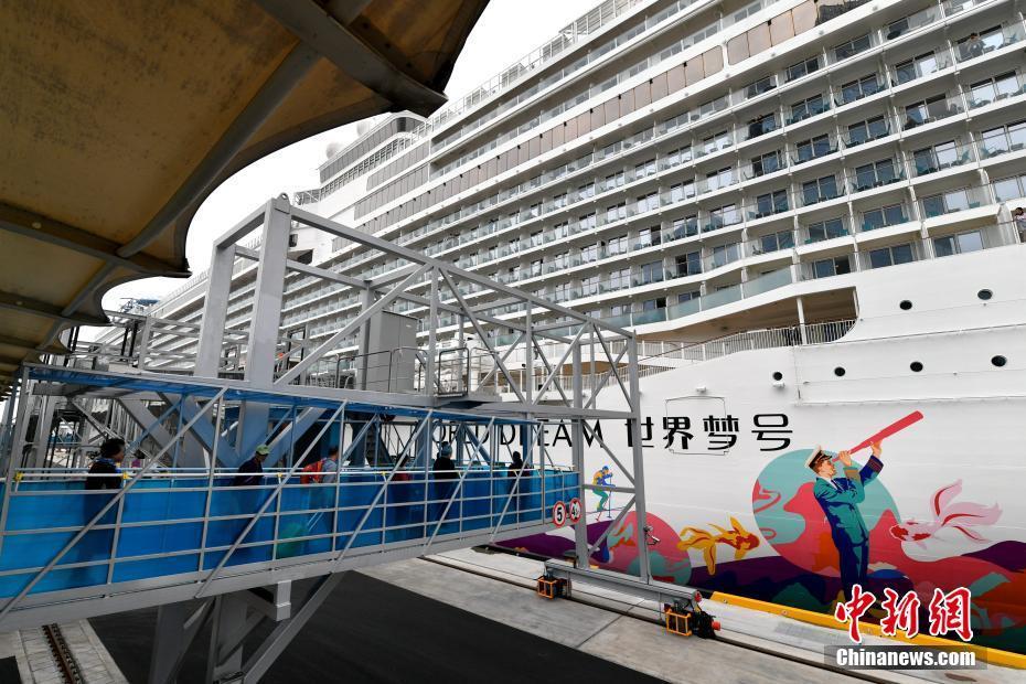 4月15日,“星夢郵輪”旗下的“世界夢號”郵輪駛進廈門港。廈門國際郵輪母港集團負責人表示,迎來“世界夢號”,意味著廈門國際郵輪母港踏上“大船時代”的新起點。“世界夢號”郵輪是列入《2019伯利茲郵輪年鑒》的世界十大最佳大型郵輪之一,噸位15萬,載客3376人,2017年底首航。圖為“世界夢號”郵輪停靠在廈門國際郵輪母港。