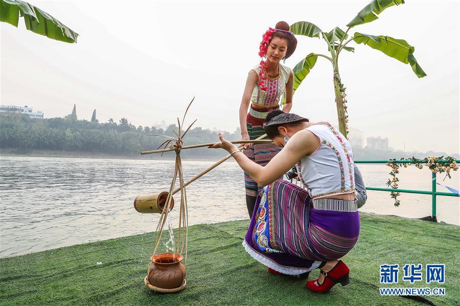 4月15日,傣族少女在瀾滄江畔舉行的潑水節(jié)取水儀式上取水。 當日,云南省西雙版納傣族自治州舉行傣歷新年取水儀式及潑水狂歡,各族群眾和游客在景洪市潑水廣場互相潑水,互祝吉祥、幸福。