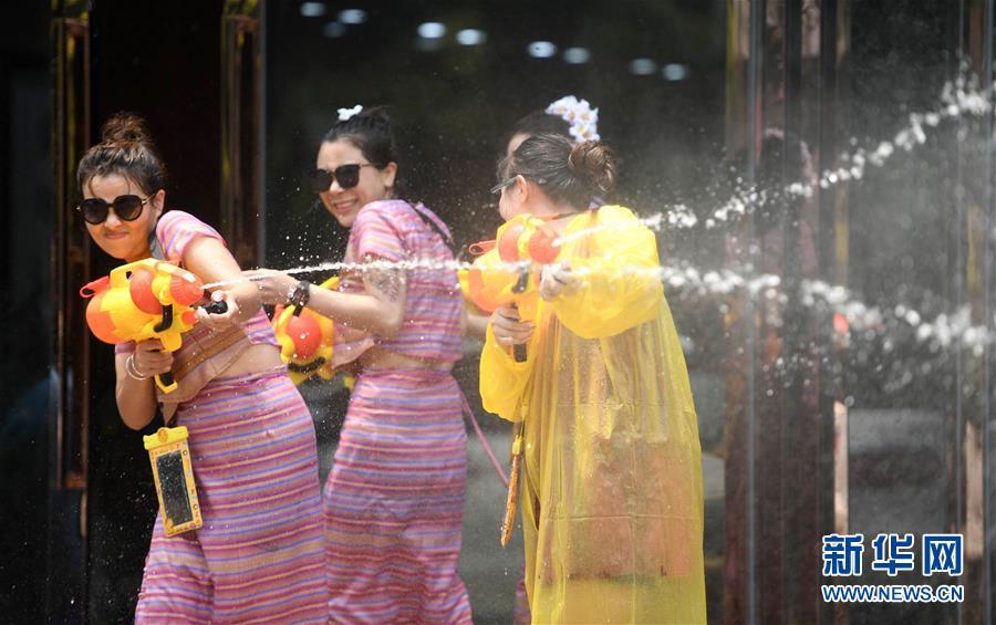 4月15日,人們在景洪市潑水廣場參加潑水節(jié)狂歡。 當日,云南省西雙版納傣族自治州舉行傣歷新年取水儀式及潑水狂歡,各族群眾和游客在景洪市潑水廣場互相潑水,互祝吉祥、幸福。