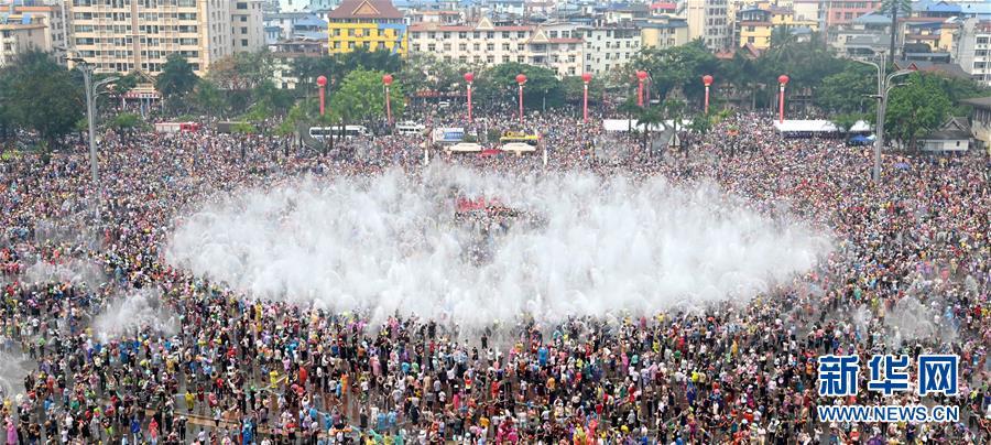 4月15日,人們在景洪市的街道上潑水狂歡。 當日,云南省西雙版納傣族自治州舉行傣歷新年取水儀式及潑水狂歡,各族群眾和游客在景洪市潑水廣場互相潑水,互祝吉祥、幸福。
