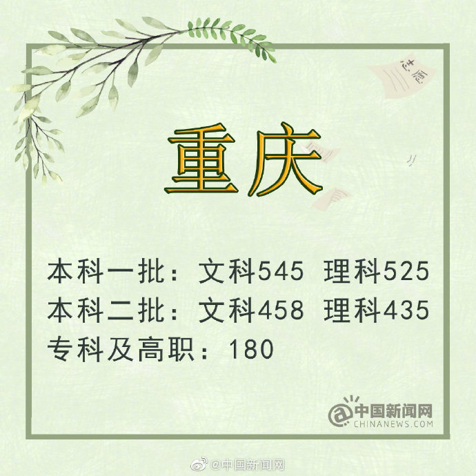 23日,重慶市公布2019年全國(guó)普通高校各類(lèi)招生錄取最低控制分?jǐn)?shù)線。第一批本科文史類(lèi)545分、理工類(lèi)525分;第二批本科文史類(lèi)458分、理工類(lèi)435分;文高職專(zhuān)科批:180分。