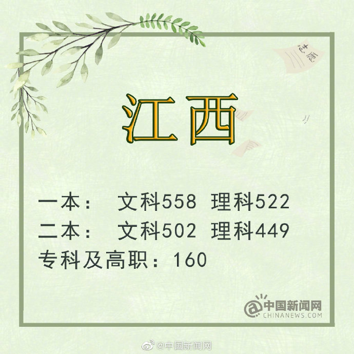6月23日,江西省2019年高考分?jǐn)?shù)線公布:第一批本科文史類(lèi)558分、理工類(lèi)522分;第二批本科文史類(lèi)502分、理工類(lèi)449分;文史、理工類(lèi)高職(專(zhuān)科):160分。