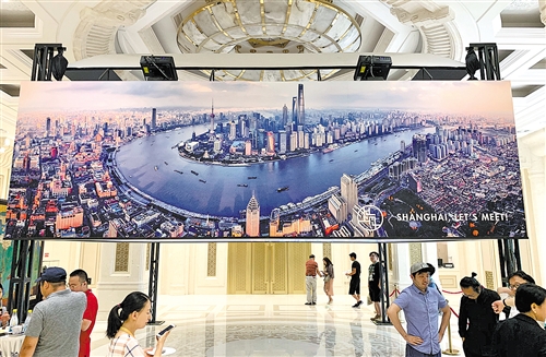7月2日,在國(guó)務(wù)院新聞辦公室舉行的新聞發(fā)布會(huì)上,四面環(huán)繞的大屏幕全方位展示了上海的新面貌。本報(bào)記者 祝君壁攝